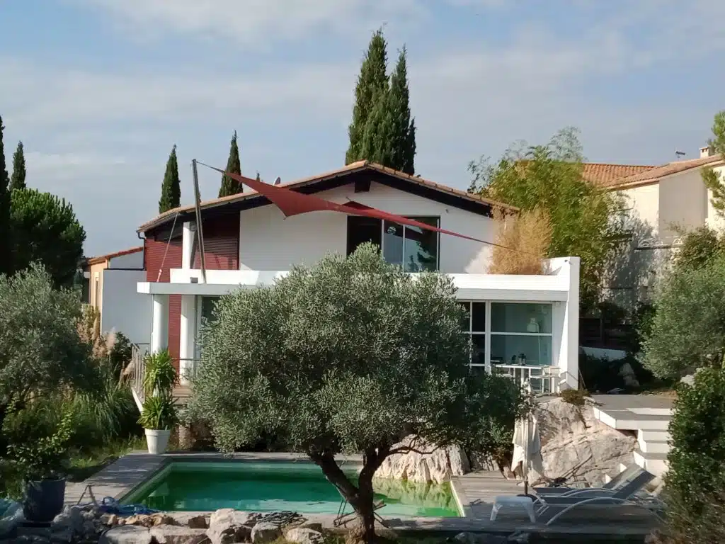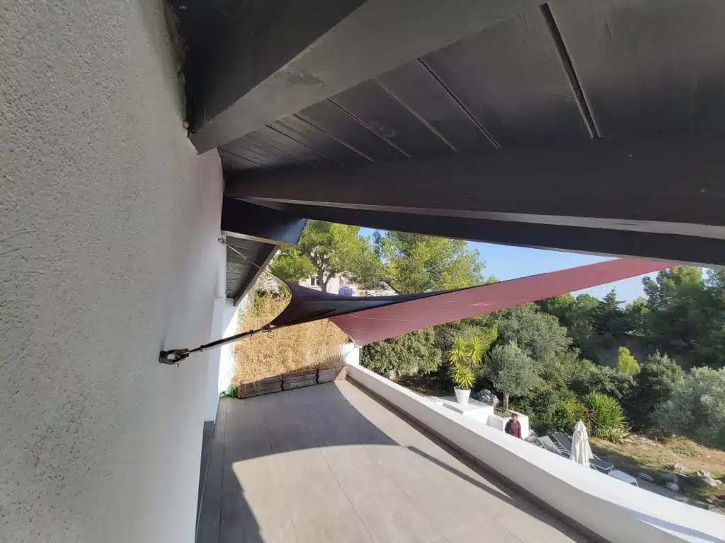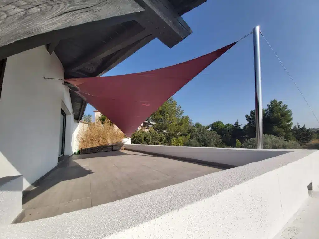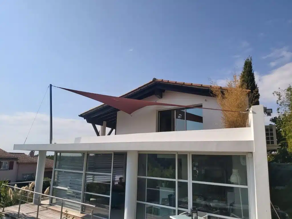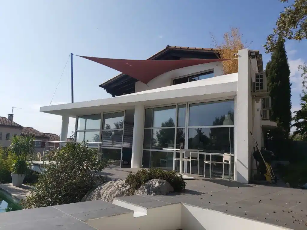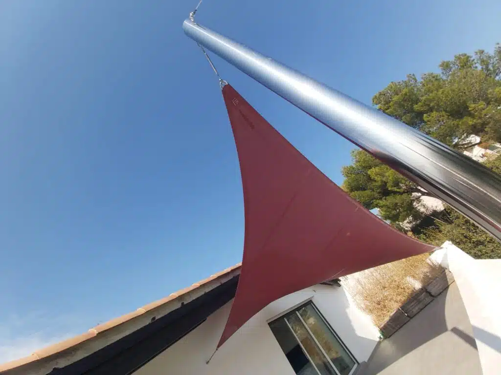 Une voile vrille papillon couleur muscat. Le mât est en inox poli miroir. Il est haubané pour résister aux vents de l’hiver. Castelnau Le Lez (34170)