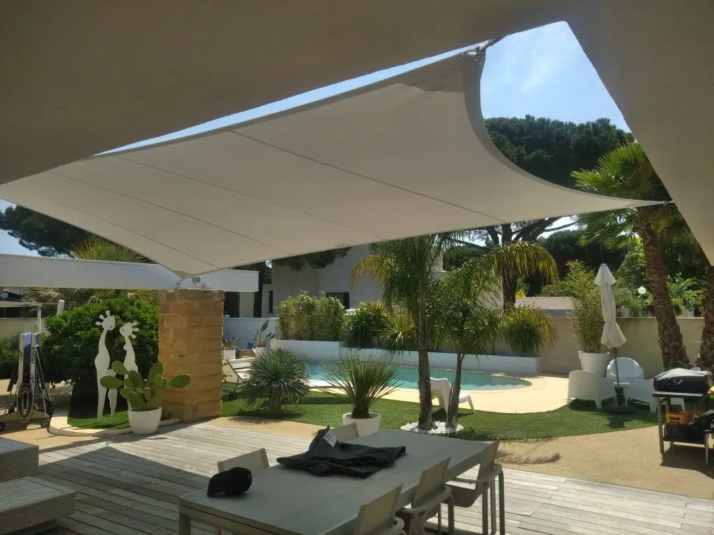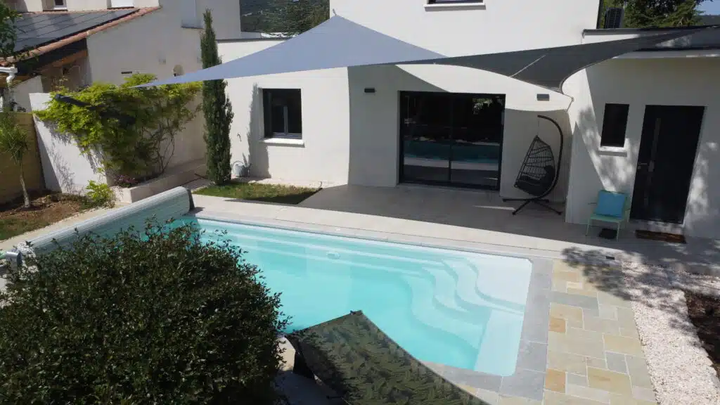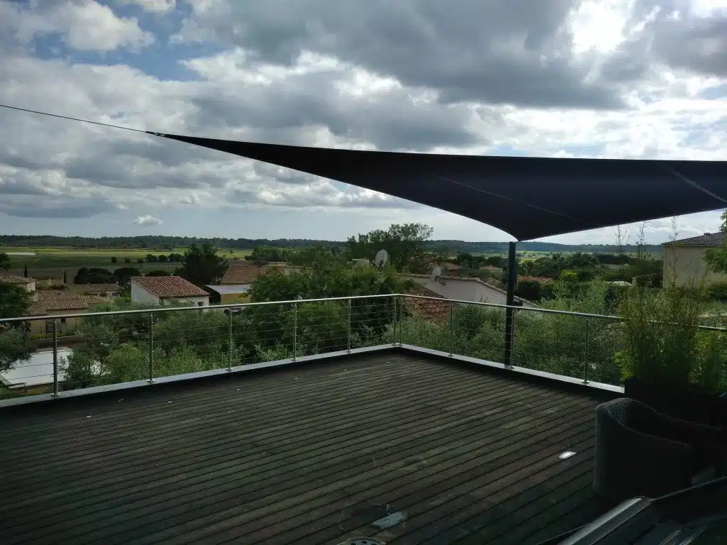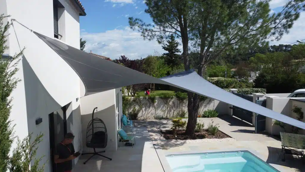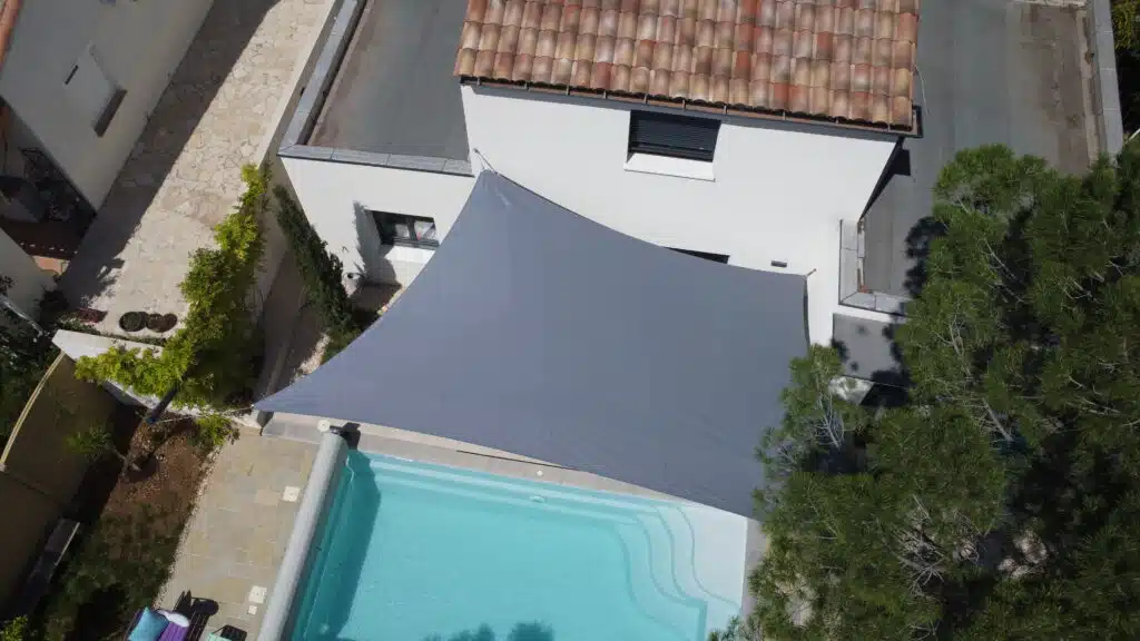 Installation d’une voile d’ombrage pour la terrasse et le bord de la piscine de cette ville aux Matelles (Hérault).