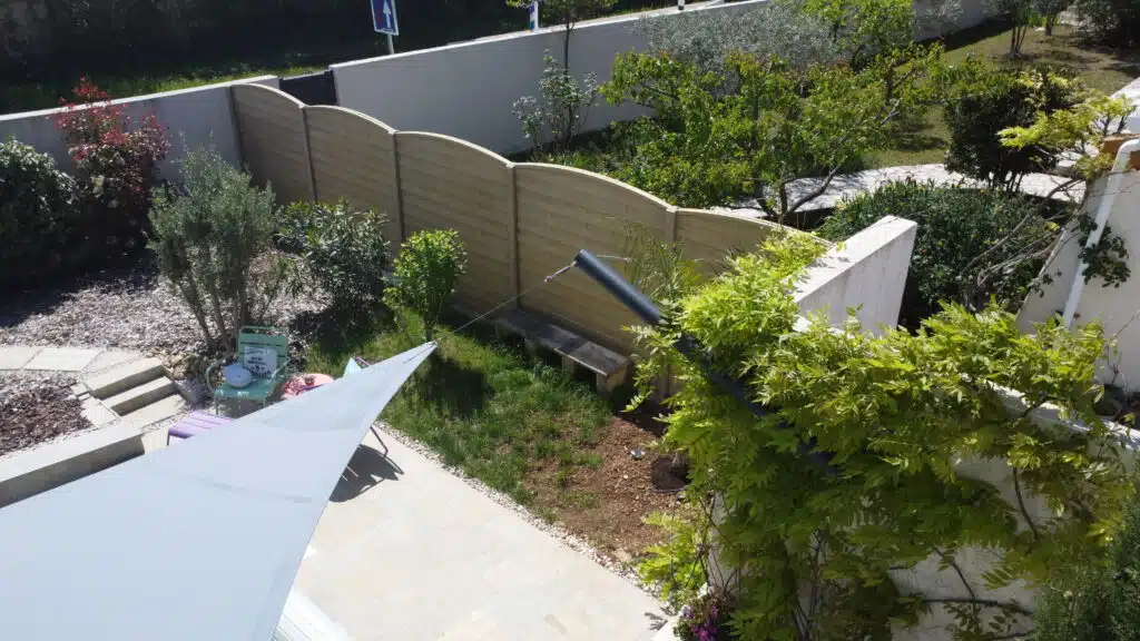 Voile d’ombrage vrillée, coloris Béton en toile Soltis 92 de Serge Ferrari : Ici, le 4eme point est fixé sur un mat en applique murale horizontal sur le mur face à la terrasse. Le mat en acier thermolaqué est réalisé sur mesure et installé par LPA Ombrage. Confection de la voile d’ombrage sur-mesure pour s’adapter parfaitement à la configuration du lieu.